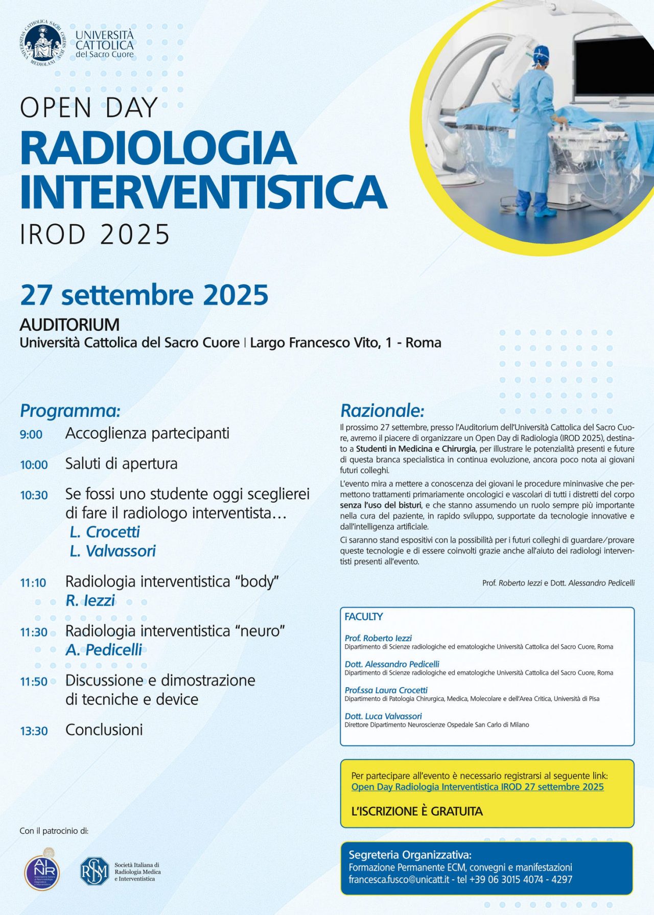 Il prossimo 27 settembre, presso l'Auditorium dell’Università Cattolica del Sacro Cuore, avremo il piacere di organizzare un Open Day di Radiologia (IROD 2025), destinato a Studenti in Medicina e Chirurgia, per illustrare le potenzialità presenti e future di questa branca specialistica in continua evoluzione, ancora poco nota ai giovani futuri colleghi.