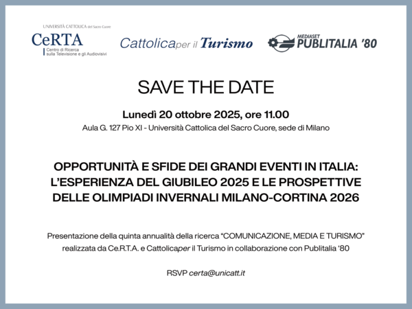 Anche di questo si parlerà il 20 ottobre alle 11 in aula Pio XI al workshop “Opportunità e sfide dei grandi eventi in Italia: l’esperienza del Giubileo 2025 e le prospettive delle Olimpiadi Invernali Milano-Cortina 2026”, evento di presentazione della quinta annualità della ricerca Comunicazione, Media e Turismo svolta da Ce.R.T.A. – Centro di Ricerca sulla Televisione e gli Audiovisivi in collaborazione con Publitalia ’80 e Cattolicaper il Turismo.