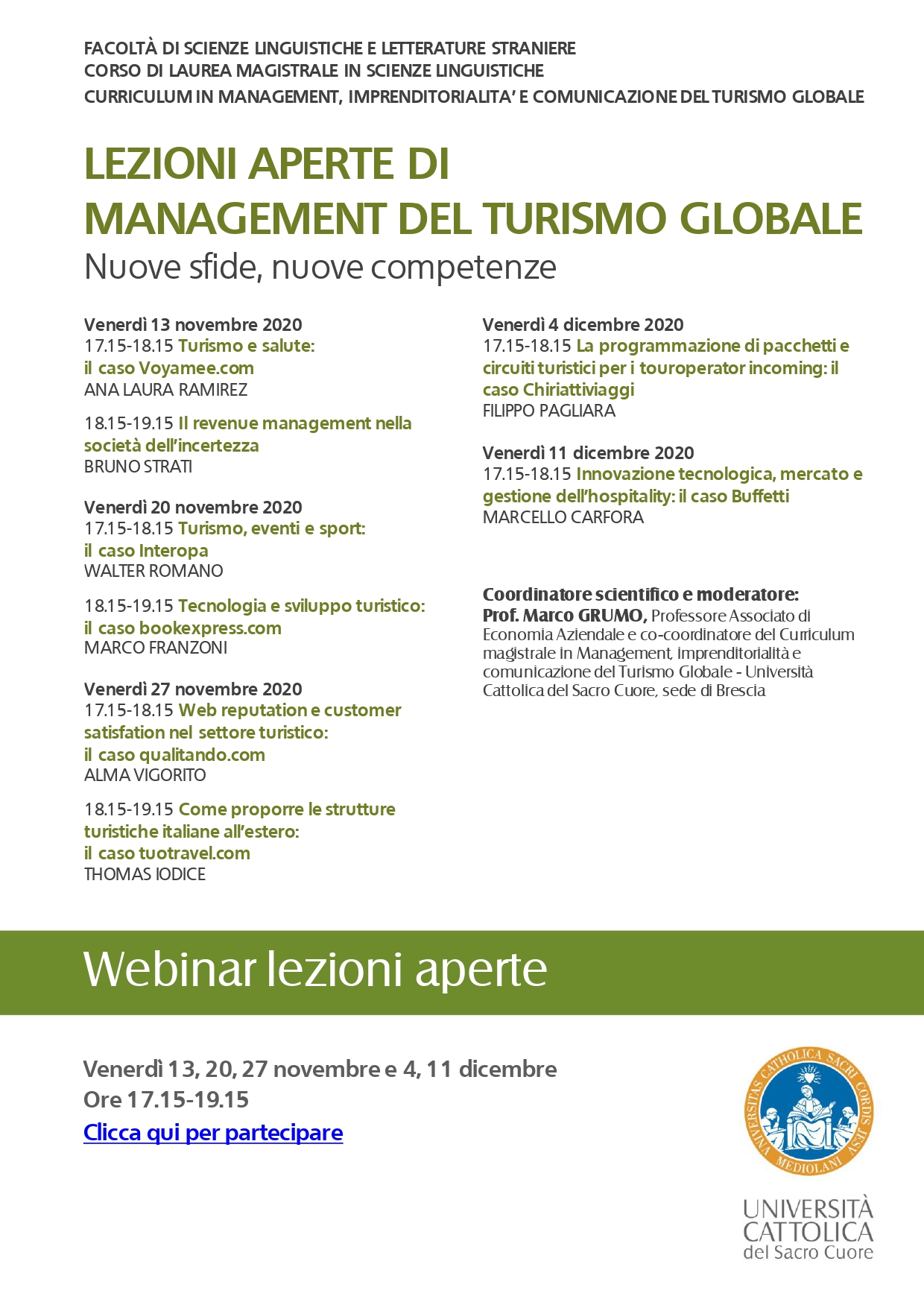 Il corso di Laurea Magistrale in Scienze Linguistiche e Letterature Straniere dell'Università Cattolica (Sede di Brescia) - curriculum in Management, Imprenditorialità e Comunicazione del Turismo globale - coordinato dal Prof. Marco Grumo, ha organizzato un ciclo di lezioni aperte con cadenza settimanale sul tema delle nuove sfide e competenze professionali del Management delle imprese turistiche.